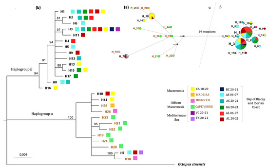 Once again, the phylogenetic relationships between the different haplotypes (Figure 3b) supported the separation of the α and β clades and the differences within the α haplogroup. Samples from northern latitudes grouped together with high support and close to Cape Verde samples; in the other group, we had the samples from Macaronesia. Interestingly, samples from Algarve and Morocco could be found in both groups.