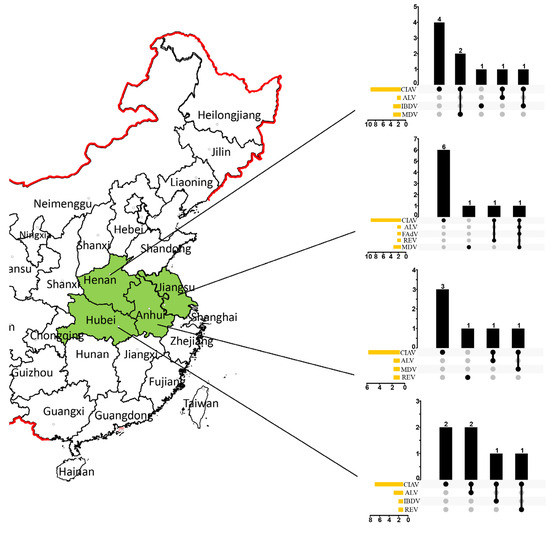 - Fang, L.; Li, Y.; Wang, Y.; Fu, J.; Cui, S.; Li, X.; Chang, S.; Zhao, P. Genetic Analysis of Two Chicken Infectious Anemia Virus Variants-Related Gyrovirus in Stray Mice and Dogs: The First Report in China, 2015. BioMed Res. Int. 2017, 2017, 6707868. [Google Scholar] [CrossRef]