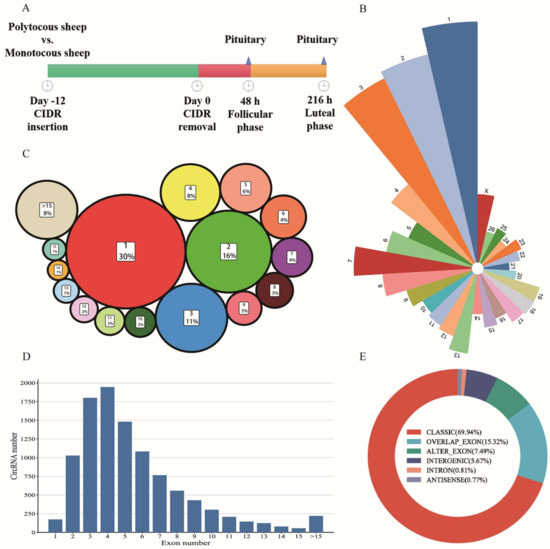 - Sun, Z.; Hong, Q.; Liu, Y.; He, X.; Di, R.; Wang, X.; Ren, C.; Zhang, Z.; Chu, M. Characterization of circular RNA profiles of oviduct reveal the potential mechanism in prolificacy trait of goat in the estrus cycle. Front. Physiol. 2022, 13, 990691. [Google Scholar] [CrossRef] [PubMed]