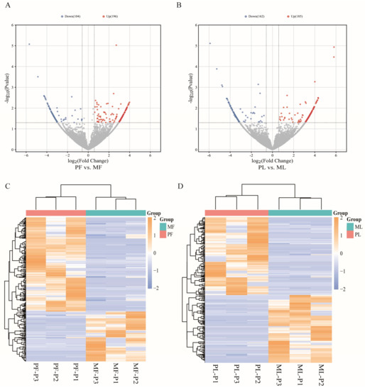 Differential expression analysis of circRNAs. (A,B) Volcano plots showing the upregulated and downregulated circRNAs in PF vs. MF and PL vs. ML. (C,D) The expression pattern of DE circRNAs and hierarchical clustering analysis in PF vs. MF and PL vs. ML.