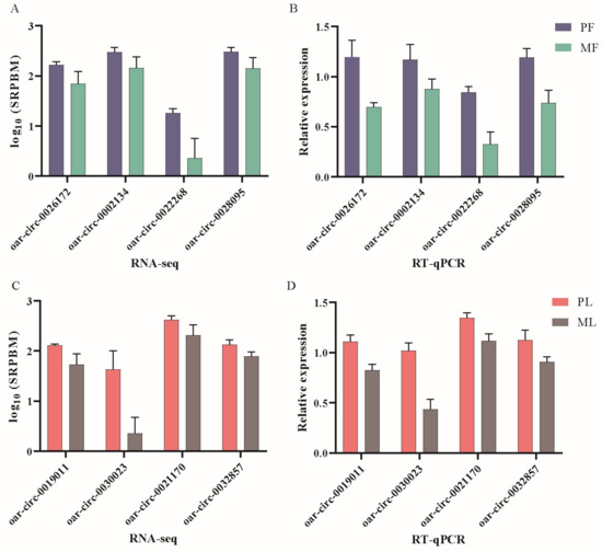 Validation of RNA-sequencing (RNA-seq) data using reverse-transcription real-time quantitative polymerase chain reaction (RT-qPCR). (A,C) RNA-seq results of eight selected circRNAs in PF vs. MF and PL vs. ML. (B,D) RT-qPCR results of eight selected circRNAs in PF vs. MF and PL vs. ML.