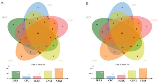 The IRESfinder software firstly judged and scored the ribosome recruitment ability of DE circRNAs sequences. In the PF vs. MF, a total of 147 differential circRNAs were predicted to contain IRES with a score greater than 0.5, and in the PL vs. ML group, there were 165. Subsequently, the coding potential prediction software CPC2, CNCI, CPAT, and PLEK were used to analyze and summarize the coding ability of DE circRNAs. CPC2, CNCI, and PLEK give the results of DE circRNAs as yes or no in the form of tags, and CPAT gives the results in the form of scores. In summary, we obtained the final result under the common conditions that IRES is included and the score is greater than 0.5, the labels of CPC2, CNCI, and PLEK are coding, and the CPAT score is greater than 0.5 (Table S6). A total of 34 circRNAs had potential coding ability in the PF vs. MF (Figure 4A), while there were 31 in the PL vs. ML (Figure 4B).