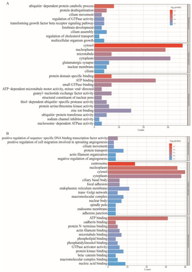 Gene Ontology functional enrichment analysis. (A) The enriched Gene Ontology (GO) terms in PF vs. MF. (B) The enriched Gene Ontology (GO) terms in PL vs. ML.