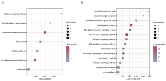KEGG enrichment analysis mainly refers to the results obtained from the online website KOBAS 3.0 (Table S8). A total of 164 items were obtained in the KEGG analysis of source genes of DE circRNAs in PF vs. MF, of which 7 items were significant according to p < 0.05 (Figure 6A). Among them, cortisol synthesis and secretion (oas04927) were directly related to the function of the pituitary gland. Genes enriched in this pathway include ITPR2, PDE8B, and PLCB1. According to the description of the pathway on the KEGG website, this pathway was also involved in the response of the pituitary gland to steroids. A total of 191 items were obtained in the KEGG analysis of source genes of DE circRNAs in PL vs. ML, of which 14 items were significant according to p < 0.05 (Figure 6B). Among them, the glucagon signaling pathway (oas04922) and estrogen signaling pathway (oas04915) are directly related to pituitary function. Genes enriched in these two pathways included AKT3, PDE3B, ITPR1, PLCB1, ATF2, and ESR1. In addition, in KEGG enrichment analysis of the two groups, other items related to pituitary function and reproduction were also obtained, such as the GnRH signaling pathway (oas04912), Oocyte meiosis (oas04114), etc. But these items were not significant (p > 0.05).