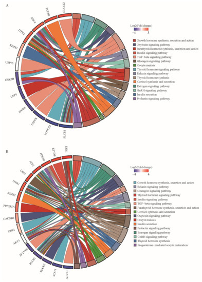 It is worth noting that although these pathways were not significant, some genes involved in these pathways were shared with significant pathways, namely, those genes just mentioned. Therefore, the changes in these genes, as well as in the circRNAs they encode, might have a greater impact on reproductive performance. Both DAVID and KOBAS can perform GO and KEGG analysis at the same time to annotate the function of genes, but DAVID has fewer KEGG items, while KOBAS has fewer GO items. We synthesized the two descriptions of gene functions and selected all items directly related to pituitary function and reproduction for integration and visualization, such as some hormone-release items (Table S9). ITPR2, SHC4, PLCB1, and GSK3B appeared in multiple pathways in PF vs. MF (Figure 7A). There were two circRNAs derived from the USP15 gene (oar-circ-0022268, oar-circ-0022266), so the log2 (fold change) is not shown in the figure. ESR1, PDE3B, ATF2, ITPR1, AKT3, and PLCB1 were present in multiple pathways in PL vs. ML (Figure 7B). There are two circRNAs derived from the ATK3 gene (oar-circ-0002271, oar-circ-0002289), and the log2 (fold change) is not shown in the figure. Interestingly, these two circRNAs have the opposite trend of change.