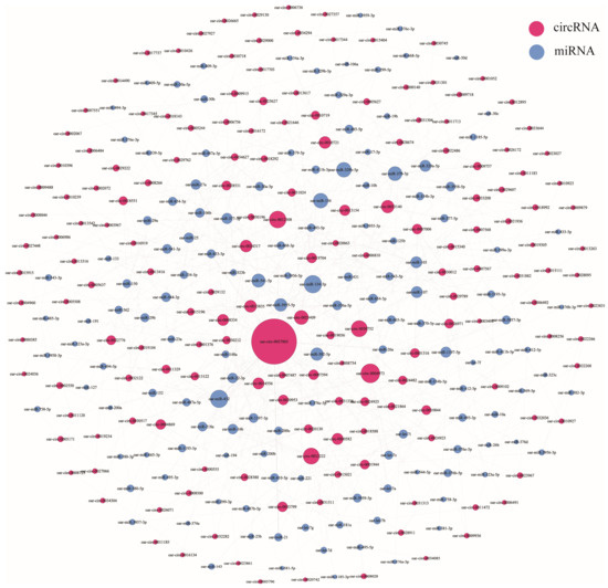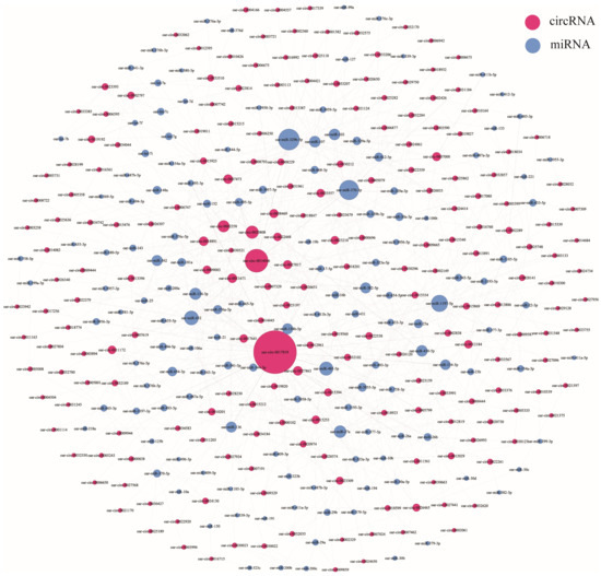 CircRNA can act as an miRNA sponge, which can reduce the inhibitory effect of miRNA on its target gene by adsorbing miRNA, and indirectly increase the expression level of the target gene. This regulatory network is called the ceRNA (competing endogenous RNA) mechanism. First, we obtained the mature sequences of all known miRNAs in sheep through the miRBase database (https://www.mirbase.org/, accessed on 25 May 2023) [39]. The interactions between DE circRNAs and all known miRNAs were predicted using miRanda (v3.3a) [40]. We adjusted the parameters of the software to “-sc 150” and “-en -15” to ensure the credibility of the prediction results. Finally, Cytoscape (v3.9.1) [41] was used to construct and visualize the targeting relationship between circRNAs and miRNAs.