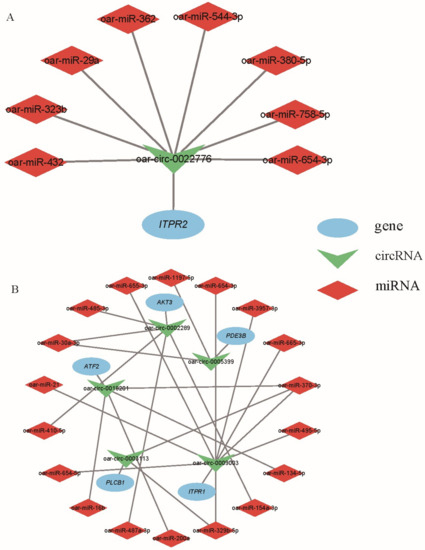 We selected the circRNAs encoded by the genes of interest and their relationship pairs, that is, the genes that were finally screened in the functional enrichment analysis, and visualized the gene–circRNA–miRNA relationship using Cytoscape (v3.9.1). Only ITPR2 (encoding oar-circ-0022776) was predicted in 8 circRNA–miRNA relationship pairs in the follicular phase (Figure 10A), and a total of 23 pairs were predicted in the luteal phase (Figure 10B). ESR1 (encoding oar-circ-0032298) and AKT3 (encoding oar-circ-0002271) were not predicted in the result. AKT3 encoded two different circRNAs that have opposite changing trends and different miRNA-binding abilities. PLCB1 encoded different circRNAs in the two periods (follicular phase: oar-circ-0003112, luteal phase: oar-circ-0003113) and had different miRNA-binding capabilities; only oar-circ-0003113 had predicted results.
