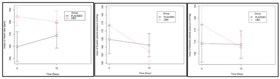 Cardiac rate and systolic and diastolic blood pressure measurements at day 0 and day 15 of CBD administration (effect of the group–time interaction with p values of 0.081, 0.293, and 0.287, respectively (Supplementary Table S1)).