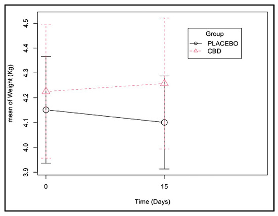 Weight change observed from days 0 and 15 of CBD administration (effect of the group–time interaction with a p-value of 0.121 (Supplementary Table S2)).