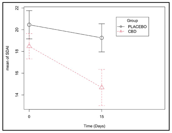 During the observation period, the effect of the CBD administration on recovery over time was more significant than the effect of time alone, as shown by the improvement in SDAI scores (p < 0.001 for the interaction group:time and p = 0.003 for the effect of time alone). Looking at the coefficients, it was possible to verify that on average, the CBD group had 2.6 points less in the SDAI score than the placebo group at the end of the 15-day treatment (Figure 3 and Supplementary Table S4).