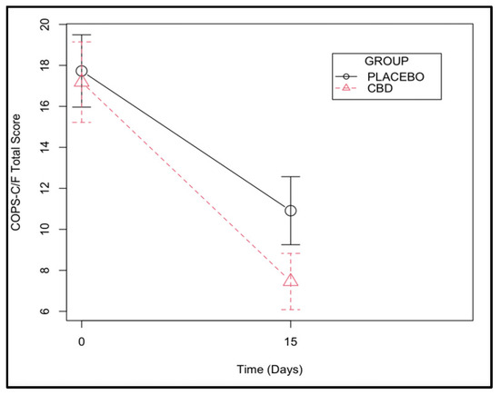 Stomatitis Disease Activity Index scores determined at days 0 and 15 in the CBD and placebo groups (effect of the group–time interaction with p-value < 0.001 (Supplementary Table S4)).