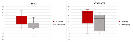 The average percentual response rate in the SDAI scores for the CBD group was 22.5% (standard deviation (s.d.) of 18.7), and for the placebo group, it was 4.9% (s.d. of 15.9) and significantly different (p = 0.028) (Figure 5). Indeed, one case in the CBD group increased on the SDAI index at day 15, as did five cases in the placebo group. The average percentual response rate on the COPS-C/F for the CBD group was 55.2% (s.d. of 27.06), and for the placebo group, it was 38.2% (s.d. of 28.8) but not significantly different (p = 0.169) (Figure 5). None of the cats increased their COPS-C/F scores in the CBD group, but one case did in the placebo group (Supplementary Table S6).