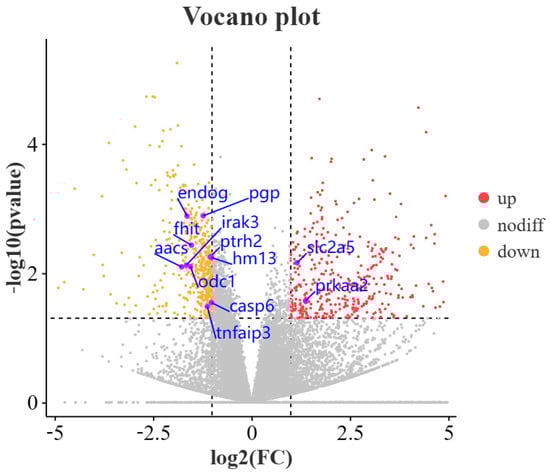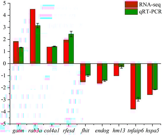 To verify the accuracy of the sequencing results, 9 DEGs were randomly selected for qRT-PCR in two groups. The given primers were designed by Primer 3 based on the transcripts obtained by sequencing (Table S2). The total RNA of liver samples from all groups was extracted using a TRIzol Reagent Kit, and cDNA was obtained by reverse transcription according to the instructions provided with an RT SuperMix for qPCR (+gDNA wiper) kit (Vazyme, Guangzhou, China). The 10 μL qRT-PCR system included 5 μL of ChamQ SYBR qPCR Master Mix (GDSBIO, Guangzhou, China), 0.2 μL of each primer (10 μM), 1 μL of template cDNA, and 3.6 μL of ddH2O. LightCyeler 480 Multiwell Plate 384 (Roche, Ludwigshafen, Germany) was applied for qRT-PCR, and the reaction program was as follows: pre-denaturation at 95 °C for 30 s, followed by 40 cycles of 95 °C for 3 s and 60 °C for 30 s. Three reactions per sample were performed, and gapdh was used as an internal reference gene to normalize the relative expression levels of all verified genes. Relative expression levels of genes were calculated using the 2−ΔΔCt method, and plots were generated using Origin 2019b (OriginLab Northampton, Northampton, MA, USA).