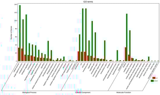 GO enrichment analysis of DEGs in HS vs. HT. The abscissa is the secondary GOterm, and the ordinate is the number of differential genes in the term. Red indicates upregulation and green indicates downregulation.
