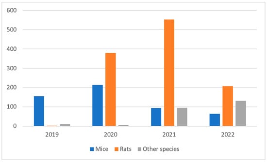 From the start of the pilot in October 2019 to the end of 2022, over 500 mice, 1000 rats and 240 animals of other species have been rehomed. Other species include chickens, guinea pigs, hamsters, goats, zebra finches and even a python and an iguana (Figure 1).