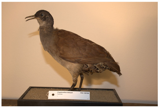 - Winkler, D.W.; Billerman, S.M.; Lovette, I.J. Tinamous (Tinamidae), ver. 1.0. In Birds of the World; Billerman, S.M., Keeney, B.K., Rodewald, P.G., Schulenberg, T.S., Eds.; Cornell Lab of Ornithology: Ithaca, NY, USA, 2020. [Google Scholar] [CrossRef]
