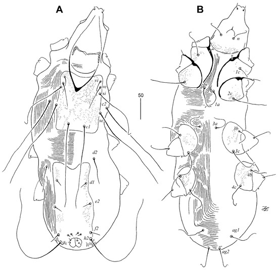 All measurements in the description are presented in micrometers. The paratypes’ measurements are indicated in brackets, appearing after the data for the holotype. The idiosomal setation adheres to Grandjean’s classification [25] as adapted for Prostigmata by Kethley [26]. The leg chaetotaxy follows the nomenclature proposed by Grandjean [27], while the morphological terminology is in accordance with Skoracki [24]. The scientific and common names of the birds are based on Clements et al. [2].