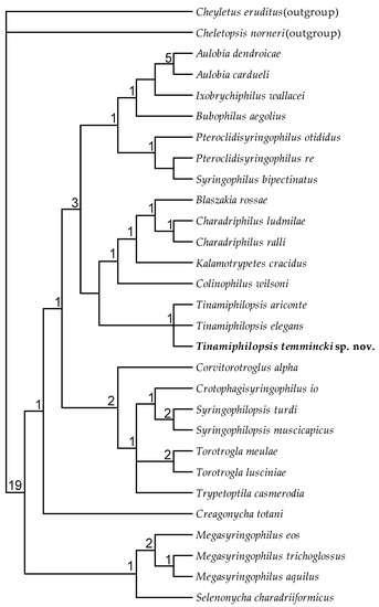Because the monophyly of the family Syringophilidae was tested with numerous outgroups and always received high support [30,31,32], only two outgroups were used in the analyses, a free-living predator Cheyletus eruditus (Schrank) and a quill-inhabiting predator Cheletopsis norneri (Poppe), both belonging to the sister family Cheyletidae.