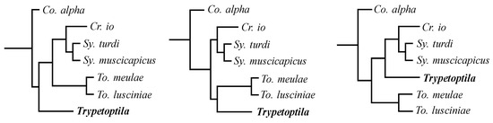 Three equally parsimonious trees were produced based on the initial analysis, with all characters being treated as unordered and unweighted (tree length 114, consistency index (CI) for phylogenetically informative characters—0.50, retention index (RI)—0.71, and rescaled consistency index (RC)—0.35); the character data and data matrix are presented in Supplementary Table S1. The strict consensus of these trees is shown in Figure 5. The differences between these trees lay only in the position of the genus Trypetoptila in relation to the genera Crotophagisyringophilus, Syringophilopsis, and Torotrogla (Figure 6). The successive weighting according to the rescaled consistency index did not change the topology of the strict consensus tree.
