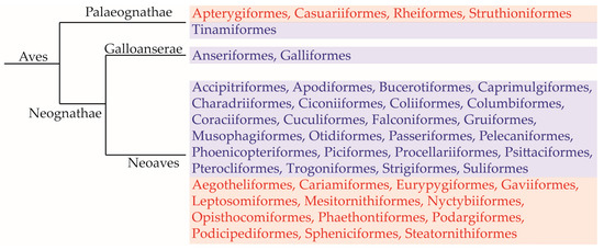 - Livezey, B.C.; Zusi, R.L. Higher-order phylogenetics of modern Aves based on comparative anatomy. Neth. J. Zool. 2001, 51, 179–205. [Google Scholar] [CrossRef]