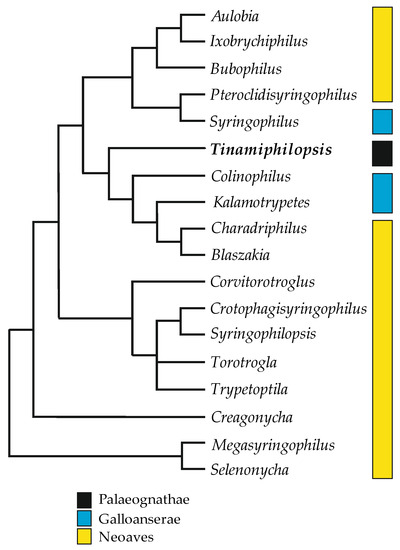 In 2013, Skoracki et al. [21] presented the first, but not fully resolved, phylogeny of syringophilid mites, where the genus Tinamiphilopsis was placed not as a sister lineage to the other syringophilid genera but in the core of the tree. These results contradicted the previous hypothesis [22,23] that the initial association of the genus Tinamiphilopsis was with Tinamiformes. The results obtained in the current study support the latter hypothesis. In the syringophilid tree, mites on the earliest derivate branches, i.e., Selenonycha Kethley and Megasyringophilus Fain et al., are associated with birds of the advanced clade Neoaves (Charadriiformes and Psittaciformes, respectively). In contrast, the mite genera associated with the earliest derivate clades of extant birds, Tinamiformes (Palaeognathae) and Galloanserae (Anseriformes and Galliformes), are mosaically distributed in the core of the tree (Figure 8). This contradiction between the presumable syringophilid parasitism of the common bird ancestor and the phylogenetic pattern obtained could be explained by the multiple switches (secondary infestation) from hosts of the Neoaves clade to palaeognathous and galloanserae birds and subsequent co-speciation.