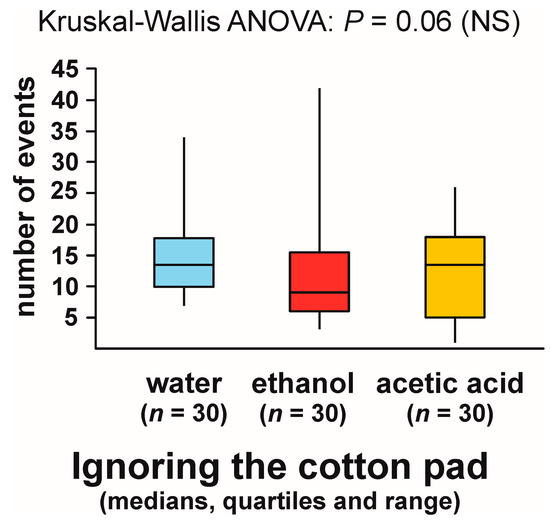 The numbers of observations of ignoring the experimental object (a cotton pad soaked in water, aqueous solution of ethanol, or aqueous solution of acetic acid) recorded during field tests with workers of the narrow-headed ant Formica exsecta. NS: not significant.
