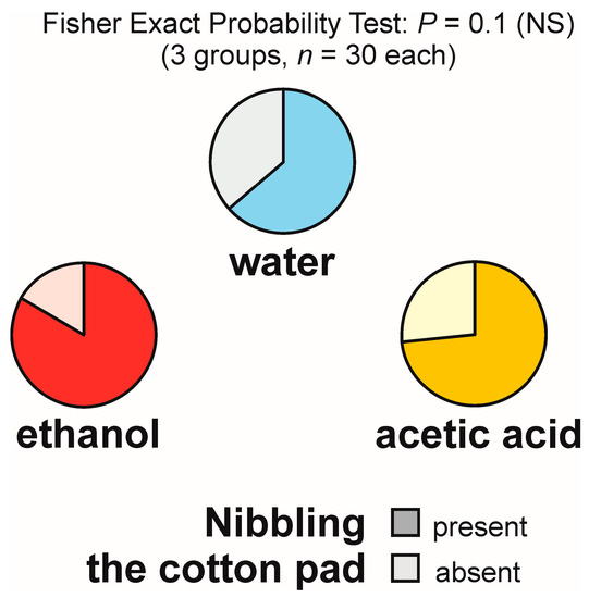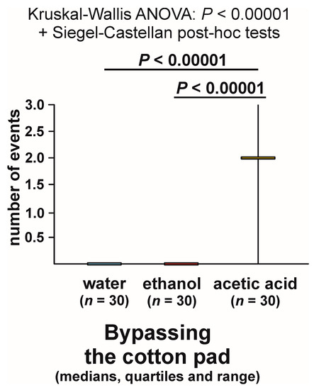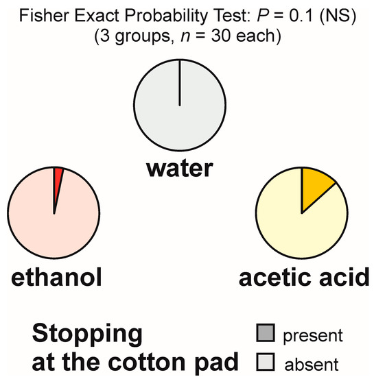 Stopping at the experimental object was relatively infrequent and was never observed during the tests with water. It was recorded only during one test with ethanol and four tests with acetic acid (Figure 2), in both cases at a rate of one observation per test. The overall analysis of the rate of occurrence of that behaviour carried out with the use of 2 × 3 Fisher Exact Probability Test discovered only a non-significant trend (Figure 2). As that test did not yield significant results, pairwise post hoc comparisons of the experimental groups by means of the 2 × 2 Fisher Exact Probability Test were not carried out.