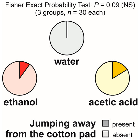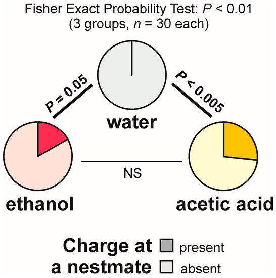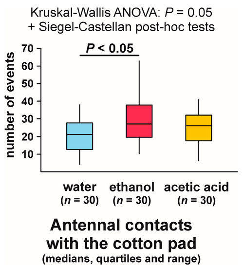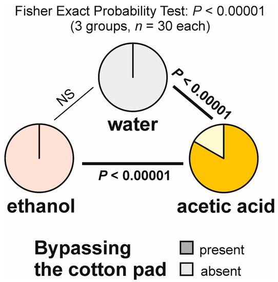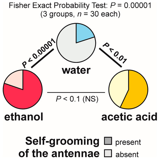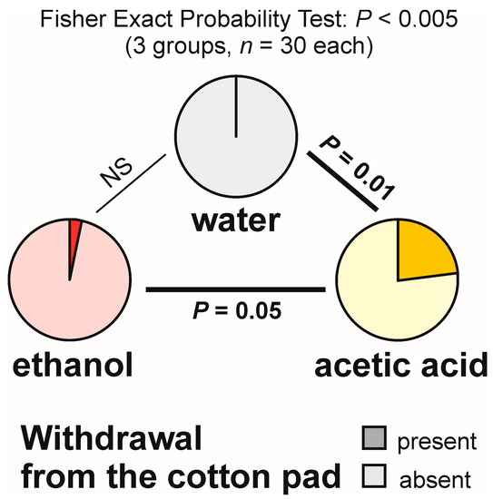 The rate of occurrence of the tests during which at least one worker of the narrow-headed ant (Formica exsecta) was observed to withdraw from the experimental object (a cotton pad soaked in water, aqueous solution of ethanol, or aqueous solution of acetic acid). The data obtained for all tested groups were compared by means of the 2 × 3 Fisher Exact Probability Test followed by pairwise post hoc comparisons carried out by means of the 2 × 2 Fisher Exact Probability Test.