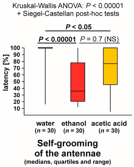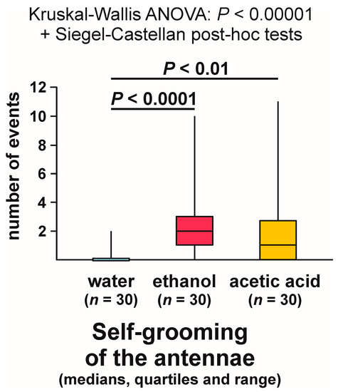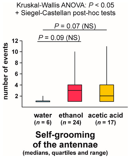 In the case of three behavioural categories (nibbling of the experimental object, self-grooming of the antennae, and charge at a nestmate), we also carried out additional analyses of the latency from the start of the test to the first observation of that behaviour, and of the number of observations of that behaviour recorded during the test in which we took into account only the tests during which the behaviour in question was expressed. In the case of the first two behavioural categories, these additional analyses were carried out by means of the Kruskal–Wallis ANOVA followed by Siegel and Castellan post hoc tests for pairwise comparisons of independent data if Kruskal–Wallis ANOVA yielded a significant result. In the case of the charge at a nestmate, we had to compare only two groups, ants tested with ethanol and ants tested with acetic acid, as that behaviour was never observed during the tests with water. Therefore, we compared these data by means of the two-tailed Mann–Whitney U test.