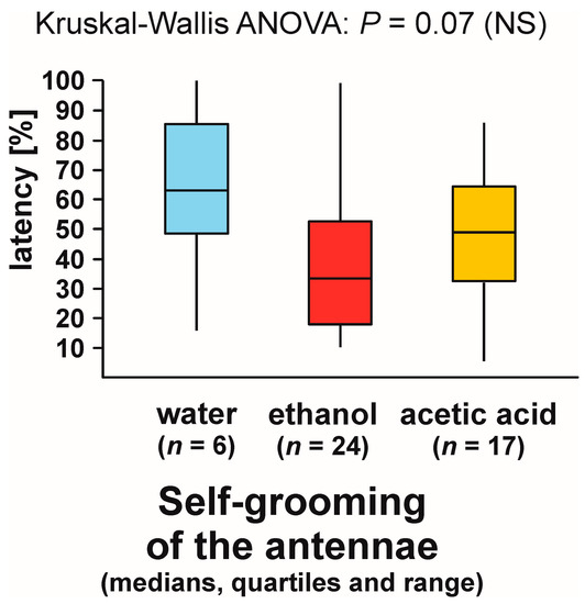 However, in the case of the numbers of observations of that behaviour recorded during the tests with different experimental objects Kruskal–Wallis ANOVA discovered a non-significant trend (Figure 1). The values of that variable tended to be the lowest in the case of the tests with ethanol. However, as Kruskal–Wallis ANOVA analysis did not yield a significant result, post hoc comparisons of the data obtained for specific pairs of experimental groups were not carried out.