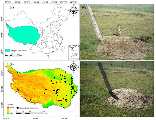 Study area and species distribution points in the Qinghai–Tibet Plateau. (A) The Qinghai–Tibet Plateau; (B) the Himalayan marmot distribution site; (C) Himalayan marmots (captured by infrared camera in Tianzhu Tibetan Autonomous County, China, on 3 September 2021); and (D) Grassland landscape inhabited by Himalayan marmots (captured by infrared camera in Tianzhu Tibetan Autonomous County, China, on 3 September 2021).