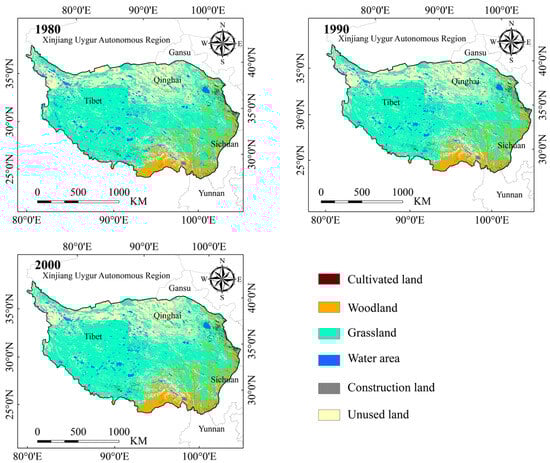Land-use types of the Qinghai–Tibet Plateau in three time periods.