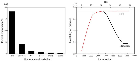 The MaxEnt model performed well, with AUC and CBI values of 0.861 and 0.944, respectively (Table S4). The results indicated that the relative contribution rate of environmental variables to the Himalayan marmot was different from that of our model. The HFI accounts for 72.80% of the effects on Himalayan marmot distribution and an elevation of 16. 40%, whereas the effects of the other environmental factors on the potential distribution of the Himalayan marmot were low (Figure 3A). We plotted the response curves for the main environmental factors of the model and found that the presence probability of the Himalayan marmot increased with HFI, remained constant when the altitude was less than 3542.39 m, and decreased when the altitude was greater than this value. As the probability of the presence of the Himalayan marmot increased, the degree of HFI gradually increased, whereas HFI = 20.56 correlated with a constant probability of Himalayan marmot existence (Figure 3B).