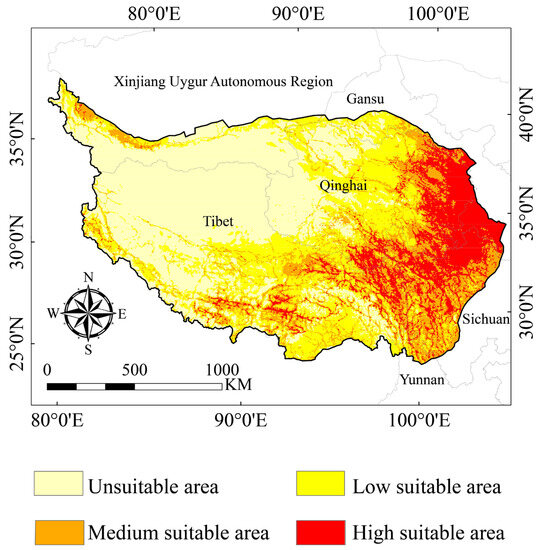 When predicting the model, 75% of the distribution points and the remaining points were selected randomly as the training dataset to evaluate the prediction effect of the model [62], and the optimized RM and FCs (RM = 3, FC = H) were modified (Table S4). The average was selected as the final simulation result [63]. We used the natural breaks (Jenks) method to reclassify the average suitable area of species into four suitable grades [64]: high suitable area (HSA), medium suitable area (MSA), low suitable area (LSA), and unsuitable area (USA). The area of all levels was calculated by a raster calculator in ArcMap.