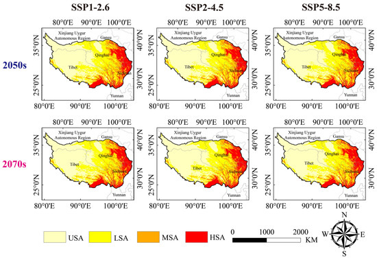 When compared with the suitable area level of marmots, the future average areas of the HSA, LSA, and USA of the Himalayan marmots in different shared socio-economic paths increased (2050s: HSA: 7.89%; LSA: 4.19%; USA: 7.10%; 2070s: HAS: 7.73%; LSA: 5.69%; USA: 6.25%). However, the MSA area decreased, with an average reduction of 29.54% and 29.74% in the 2050s and 2070s, respectively. We also found that the areas of suitable habitat that were predicted to increase in the future were mainly in the central and northern parts of the Qinghai Province and the southeastern regions of the Tibet Autonomous Region. On the other hand, the areas of suitable habitat that were predicted to decrease were mainly in the northwestern and central regions of the QTP (Figure 3B and Figure 5, Table S7). Through the analysis of the future climate scenarios for Himalayan marmot suitable habitats, we found that the centroid position of the 2050s and 2070s in different shared socio-economic paths of mass had exactly the same latitude and longitude (2050s: longitude: 99.02051, 33.01076; 2070s: longitude: 99.030034, latitude: 33.050121).