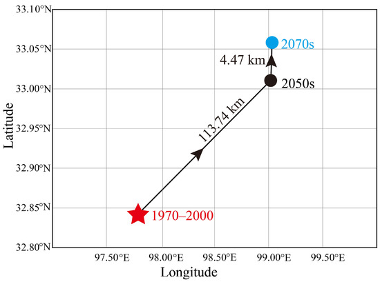 According to our study results, we found that the centroid of the suitable habitat for the Himalayan marmot moved to the northeast by 113.74 km in the 2050s, while in the 2070s, the centroid moved northeast with a migration distance of 4.47 km (Figure 6).