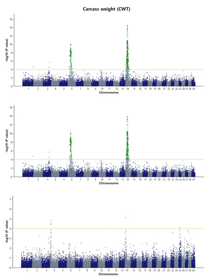Manhattan plots of genome-wide −log10 (p-values) for carcass weight in Hanwoo cattle using DGEBV (upper panel), GEBV (middle panel), and residual (lower panel) as predictors in the GBLUP method. The X-axis represents the 29 Bos taurus autosomes, and the Y-axis represents the −log10P values. The horizontal dashed line in yellow–green indicates the significance threshold at p = 1 × 10−4 (4.00).