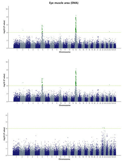 Manhattan plots of genome-wide −log10 (p-values) for eye muscle area in Hanwoo cattle using DGEBV (upper panel), GEBV (middle panel), and residual (lower panel) as predictors in the GBLUP method. The X-axis represents the 29 Bos taurus autosomes, and the Y-axis represents the −log10P values. The horizontal dashed line in yellow–green indicates the significance threshold at p = 1 × 10−4 (4.00).