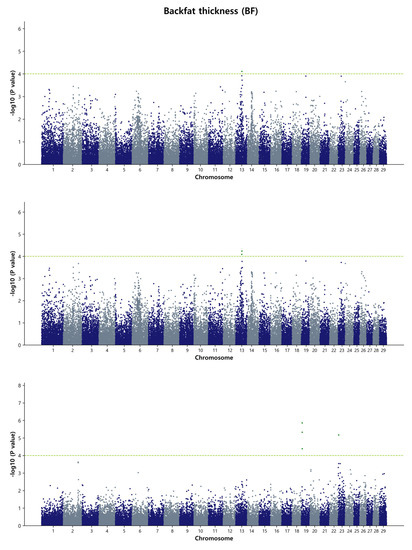 Manhattan plots of genome-wide −log10 (p-values) for backfat thickness in Hanwoo cattle using DGEBV (upper panel), GEBV (middle panel), and residual (lower panel) as predictors in the GBLUP method. The X-axis represents the 29 Bos taurus autosomes, and the Y-axis represents the −log10P values. The horizontal dashed line in yellow–green indicates the significance threshold at p = 1 × 10−4 (4.00).
