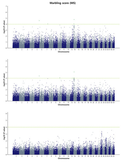 Manhattan plots of genome-wide −log10 (p-values) for marbling score in Hanwoo cattle using DGEBV (upper panel), GEBV (middle panel), and residual (lower panel) as predictors in the GBLUP method. The X-axis represents the 29 Bos taurus autosomes, and the Y-axis represents the −log10P values. The horizontal dashed line in yellow–green indicates the significance threshold at p = 1 × 10−4 (4.00).