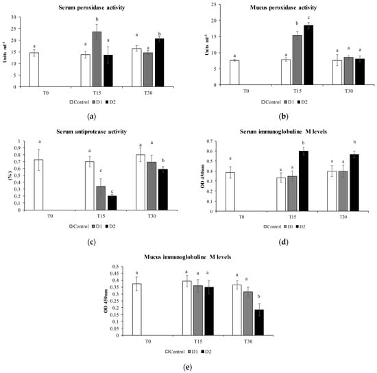 (a) Serum peroxidase activity (units mL−1). (b) Mucus peroxidase activity (units mL−1), (c) serum antiprotease activity (%), (d) serum immunoglobulin M levels (OD 450 nm) and (e) mucus immunoglobulin M levels of gilthead seabream specimens fed different diets for 15 days (T15) and 30 days (T30). Control diet (white bars), 0.05% inclusion of H. salinarum (D1, grey bars) and 0.1% inclusion of H. salinarum (D2, black bars). Values are expressed as the means ± SEM (n = 6). Statistical differences (p < 0.05) among groups are indicated by different superscripts letters.