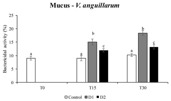 Two fish pathogenic bacteria, (Vibrio harveyi and Vibrio anguillarum) were used in the bactericidal assay. All bacterial strains were grown from 1 mL of stock culture that had been previously frozen at −80 °C. The two bacteria were grown for 48 h at 25 °C in Tryptic Soy Agar (TSA, Difco Laboratories, Detroit, MI, USA) and then inoculated into Tryptic Soy Broth (TSB, Difco Laboratories, Detroit, MI, USA), both supplemented with NaCl to a final concentration of 1% (w/v). Bacteria in TSB medium were then grown at the same temperature, with continuous agitation (100 rpm) for twenty-four hours. Exponentially growing bacteria were resuspended in sterile PBS and adjusted to 108 colony-forming units (c.f.u.) mL−1. The bactericidal activity was determined following the method of Stevens et al. [29] with some modifications using the MTT assay, which is based on the reduction of the soluble yellow tetrazolium salt (3-(4,5-dimethylthiazol-2-yl)-2,5-diphenyltetrazolium bromide) to a blue, insoluble formazan product by the mitochondrial enzyme succinate dehydrogenase [30]. Samples of 20 μL of serum collected from all individuals (n = 6 for each treatment at each time) were added to the wells of a 96-well plate. A PBS solution was added to some wells in place of the samples and served as a positive control. Aliquots of 20 μL of the previously cultured bacteria were added, and the plates were incubated for 5 h at 25 °C. After that, 25 μL of MTT (1 mg mL−1) were added to each well, and the plates were again incubated for 10 min at 25 °C to allow formazan formation. The plates were then centrifuged (2000× g, 10 min), and the precipitates dissolved in 200 μL of DMSO were transferred to a 96-well flat-bottom plate. The absorbance of dissolved formazan was measured at 570 nm with a plate reader. Bactericidal activity was expressed as the percentage of nonviable bacteria, calculated as the difference between the absorbance of surviving bacteria compared to the absorbance of bacteria from positive controls (100%).