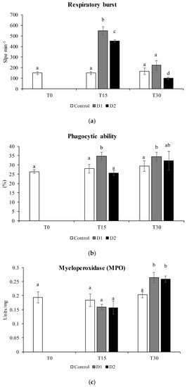 (a) Respiratory burst (slope min−1). (b) Phagocytic ability (%). (c) Myeloperoxidase in head kidney leucocytes of gilthead seabream specimens fed different diets for 15 days (T15) and 30 days (T30). Control diet (white bars), 0.05% inclusion of H. salinarum (D1, grey bars) and 0.1% inclusion of H. salinarum (D2, black bars). Values are expressed as the mean ± SEM (n = 6). Statistical differences (p < 0.05) among groups are indicated by different superscripts letters.