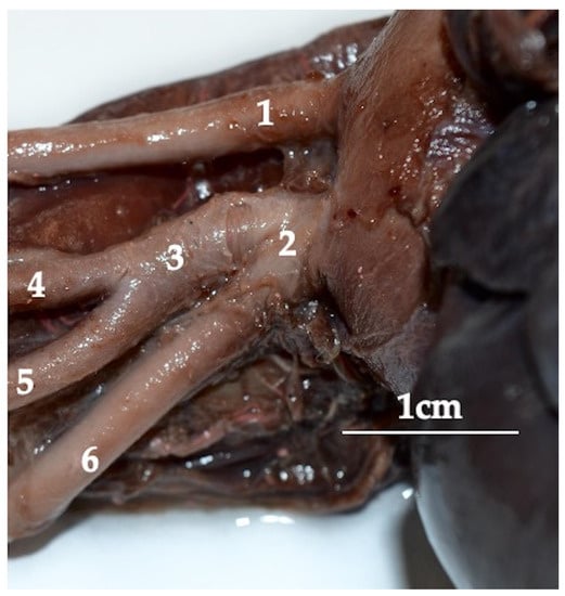 - te Shin, S.; Sim, J.H.; Kim, J.T.; Oh, H.S.; Tae, H.J.; Park, B.Y.; Kim, I.S.; Ahn, D. Branching patterns of the aortic arch in the Siberian roe deer (Capreolus pygargus Pallas, 1771). J. Vet. Med. Sci. 2018, 80, 128–132. [Google Scholar] [CrossRef] [PubMed]