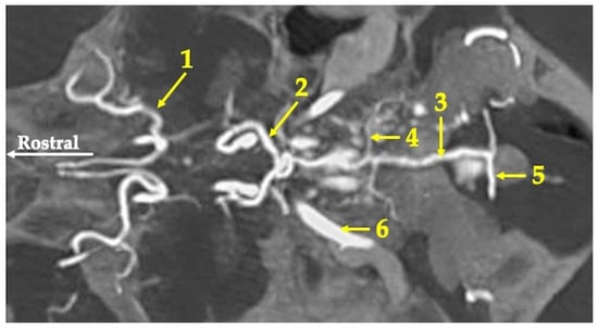 Maximum intensity projection of the agioCT scan of the head of the red kangaroo. Axial plane at the level of the bottom of the cranial cavity. 1—middle cerebral artery (arteria cerebri media); 2—caudal communicating artery (arteria communicans caudalis); 3—basilar artery (arteria basillaris); 4—caudal cerebral artery (arteria cerebri caudalis); 5—vertebral artery (arteria vertebralis); 6—internal carotid artery (arteria carotica interna).