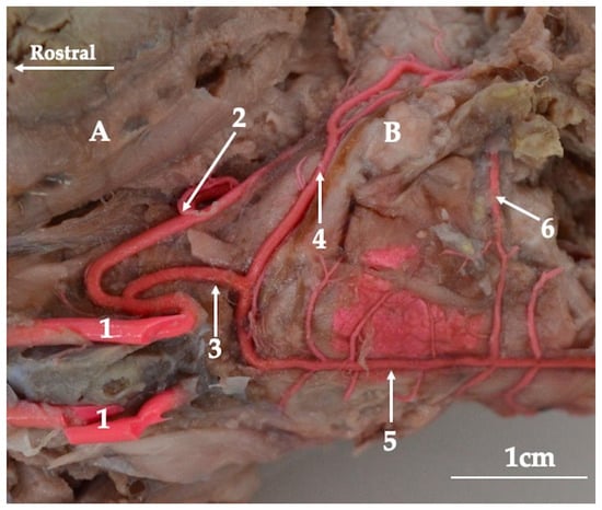 The blood reaches the internal carotid artery from the bicarotic trunk as follows. The bicarotic trunk divides into two (right and left) common carotid arteries (arteriae carotes communes). These vessels are arranged below the cervical vertebrae close to the trachea and direct towards the head. Below the atlas, from the common carotid artery, the internal carotid artery branches off. In the initial part of this vessel, there is no carotid sinus (sinus caroticus). The internal carotid artery is a strong vessel (mean 1.4 mm) throughout its entire length (Figure 5). It enters the cranial cavity via the carotid canal and stacks on the base of the sphenoid bone. The first branch, located the most caudally, is the common trunk for the caudal cerebral artery and the caudal communicating artery. The caudal cerebral artery is a small-lumen (mean 0.7 mm) vessel that supplies the caudal part of the brain but also heads to the cerebellum from its rostral side. The second vessel which branches off from the internal carotid artery is the rostral cerebral artery (arteria cerebri rostralis) (mean 0.63 mm). From its initial part, the rostral choroidal artery (arteria choroidea rostralis) branches off. This vessel runs upwards between the brain’s temporal lobe and the cerebral crus. Afterward, from the rostral cerebral artery, the middle cerebral artery (arteria cerebri media) branches off. This vessel’s lumen is bigger (mean 1.08 mm). It runs dorsally and surrounds the brain’s piriform lobe from its rostral side and branches into several branches.