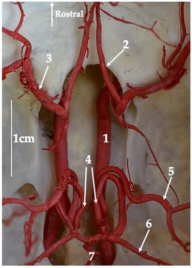 - de Alcântara, M.A.; de Santis Prada, I.L. Artérias da base do encéfalo de cães (Canis familiaris, Linnaeus, 1758). I. Estudo Anatômico de suas Origens e Comportamento. Braz. J. Vet. Res. Anim. Sci. 1996, 33, 67–71. [Google Scholar] [CrossRef][Green Version]