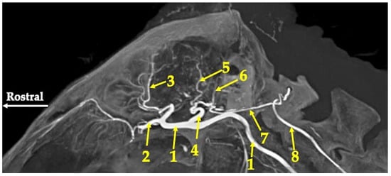 Maximum intensity projection of the agioCT scan of the head of the red kangaroo. Saggital plane. 1—internal carotid artery (arteria carotica interna); 2—internal ophthalmic artery (arteria ophthalmica interna); 3—rostral cerebral artery (arteria cerebri rostralis); 4—caudal communicating artery (arteria communicans caudalis); 5—caudal cerebral artery (arteria cerebri caudalis); 6—rostral cerebellar artery (arteria cerebelli rostralis); 7—basilar artery (arteria basillaris); 8—vertebral artery (arteria vertebralis).