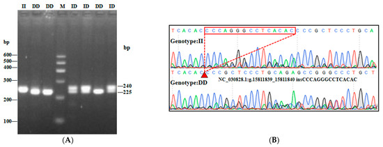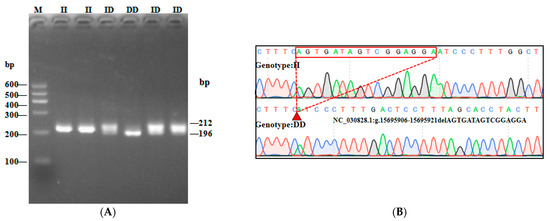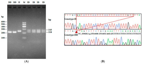 In this study, three InDel loci were identified. The P1 locus was a 16-bp deletion (NC_030828.1:g.15695906-15695921delAGTGATAGTCGGAGGA), and three genotypes were detected: II (insertion/insertion, 212/212 bp), ID (insertion/deletion, 212/196 bp), and DD (deletion/deletion, 196/196 bp) (Figure 2A). While the P2 InDel locus was a 15-bp insertion (NC_030828.1:g.15811839-15811840 insCCCAGGGCCTCACAC) and also showed three genotypes: including II (insertion/insertion, 240/240 bp), ID (insertion/deletion, 225/240 bp) and DD (deletion/deletion, 225/225 bp) (Figure 3A). P3 InDel locus was a 25-bp deletion (NC_030828.1:g.15544608-15544632delGATCTTTCCTTTCCTTTCCTTTGTT). There were three genotypes: including II (insertion/insertion, 243/243 bp), ID (insertion/deletion, 218/243 bp), and DD (deletion/deletion, 218/218 bp) (Figure 4A). DNA sequencing maps revealed mutant site sequences (Figure 2B, Figure 3B and Figure 4B).