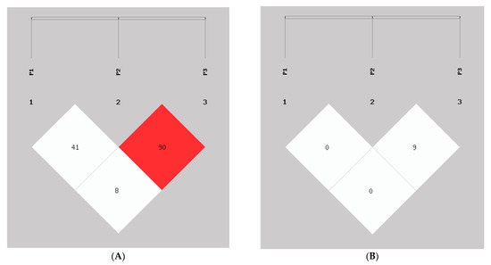 Linkage disequilibrium (LD) plot of the AKAP13 gene three InDel loci in goat, P1, P2, and P3. (A) D′ value, (B) r2 value.